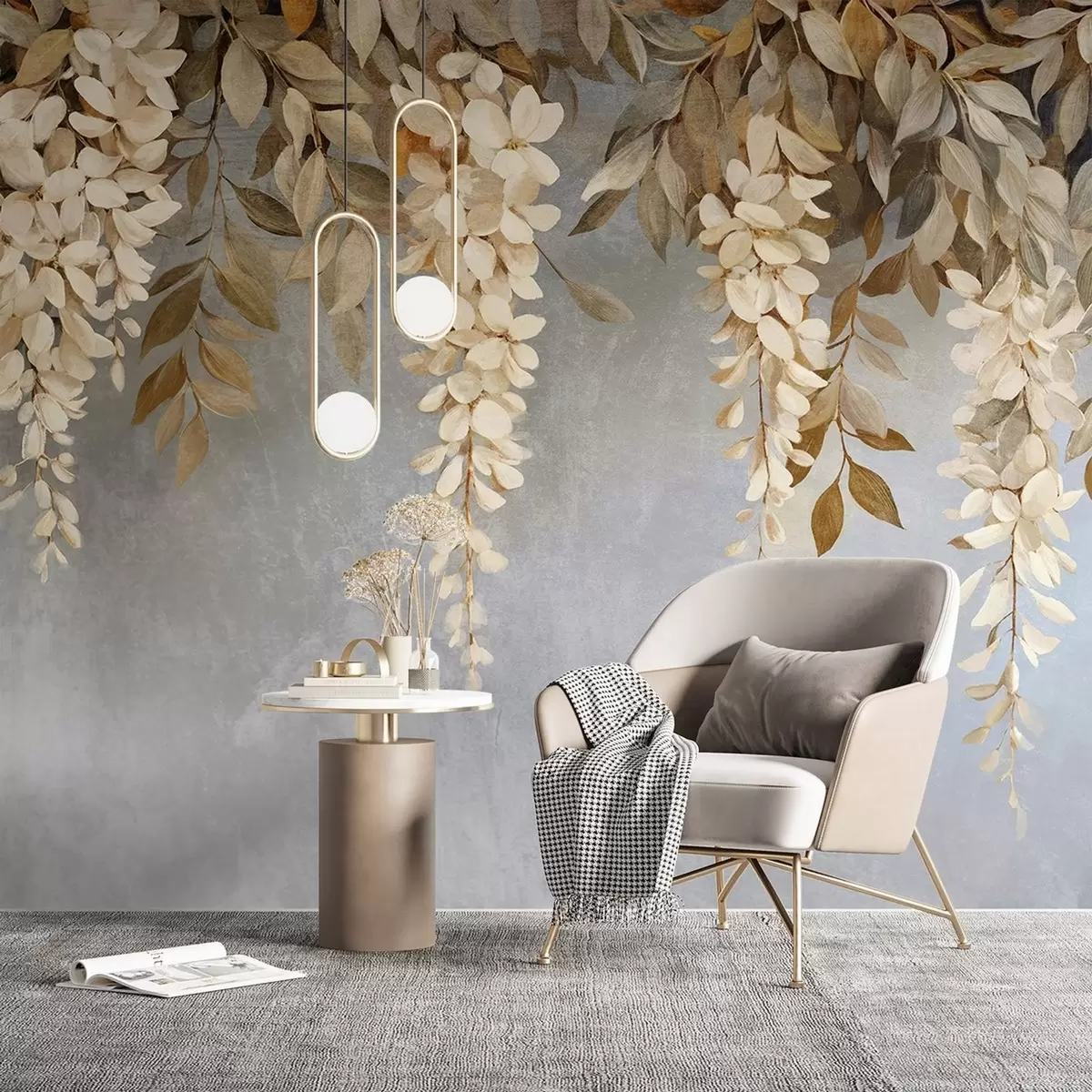 Stenske poslikave Nežni beli in svetlo bež cvetovi glicinije z listjem, ki se kaskadno spuščajo na mehkem sivem ozadju Št. w08531