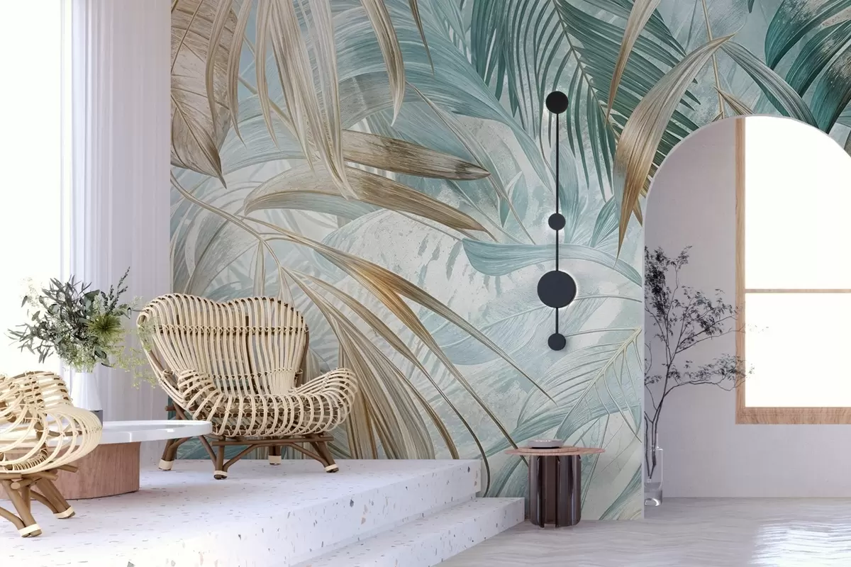 Stenske poslikave Tropski abstraktni cvetlični potisk z velikimi palmovimi listi v modrih in bež odtenkih ustvarja bujno vzdušje Št. w08532