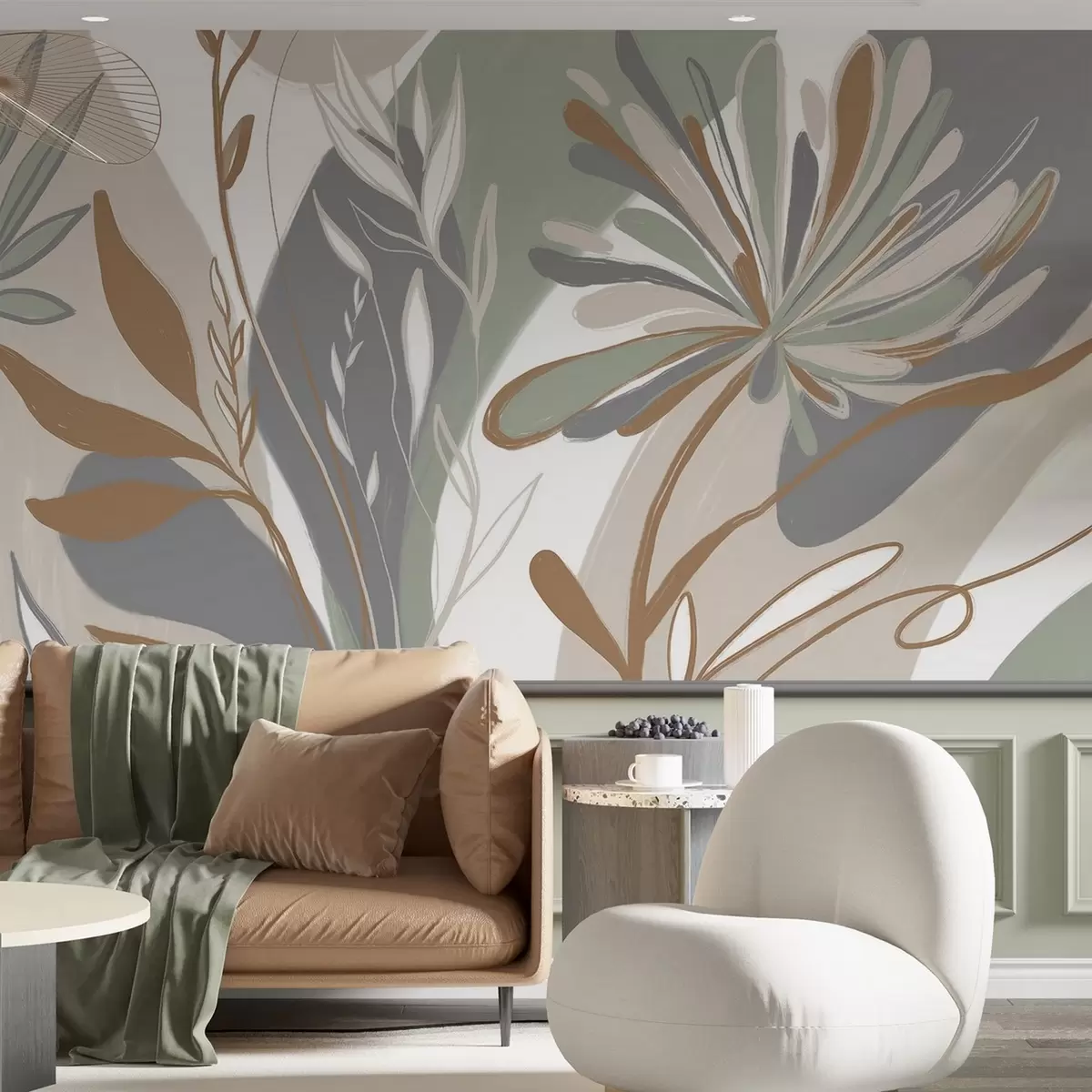 Stenske poslikave Abstraktni cvetlični minimalistični tisk s stiliziranimi listi in cvetnimi listi v zelenih, sivih in bež odtenkih Št. w08536