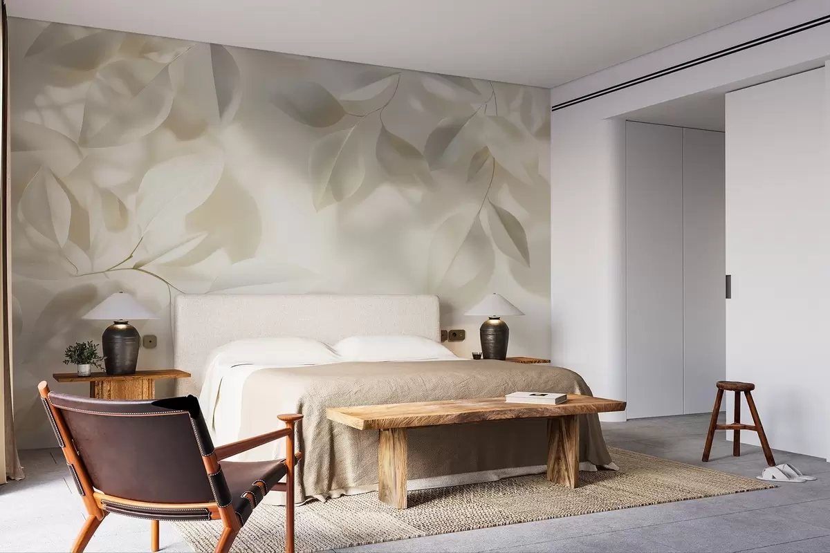 Stenske poslikave Viseče bele veje z listi ob steni s sončno svetlobo Št. w08552