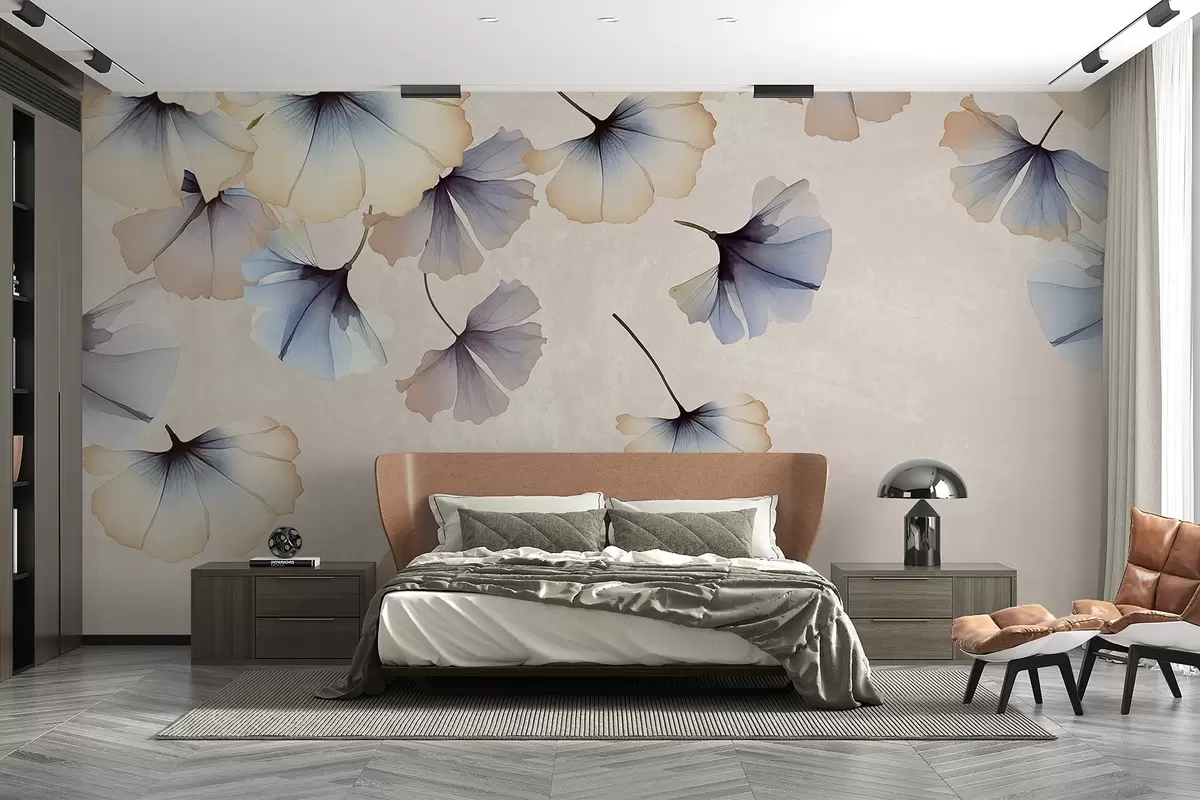 Stenske poslikave Pastelno obarvani modri in bež listi ginka z nežnimi cvetnimi lističi, ki lebdijo v zraku na teksturiranem ozadju Št. w08578