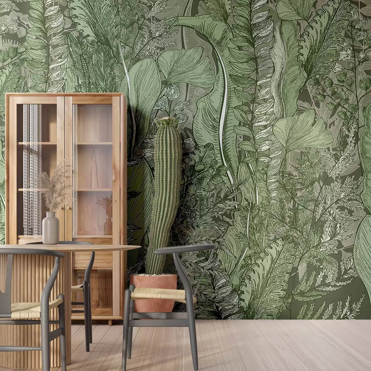 Stenske poslikave Bujen, zelen gozd z različnimi vrstami praproti, listov in listja v zelenih odtenkih Št. w08579