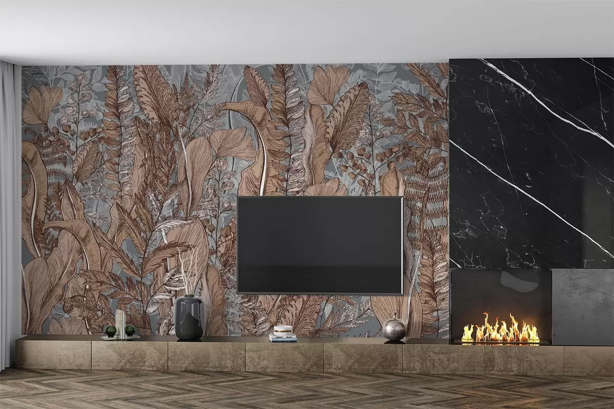 Stenske poslikave Bujen, zelen gozd z različnimi vrstami praproti, listov in listja v rjavih, modrih in sivih odtenkih Št. w08579v1