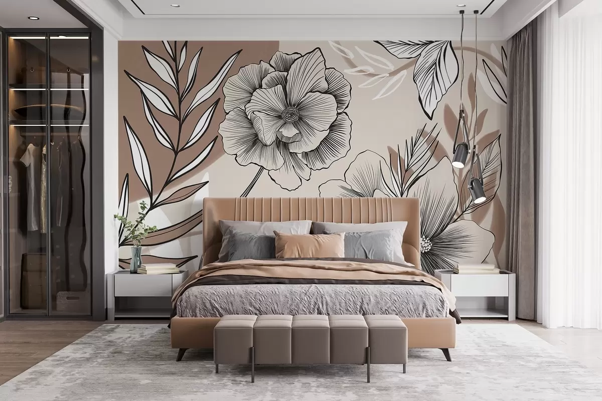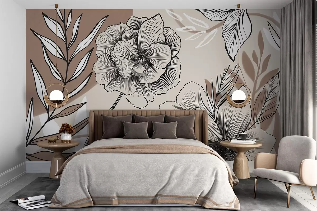 Stenske poslikave Velike črno-bele grafične rože s podrobnimi listi na bež abstraktnem ozadju Št. w08580