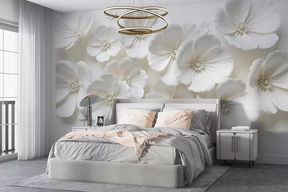 Stenske poslikave Beli cvetovi z nežnimi cvetnimi lističi in središči na svetlem ozadju Št. w08587