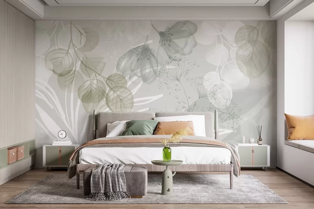 Stenske poslikave Cvetlični elementi evkaliptusa v zelenih in belih odtenkih s prekrivajočimi se listi in cvetnimi listi v minimalističnem slogu Št. w08599v1
