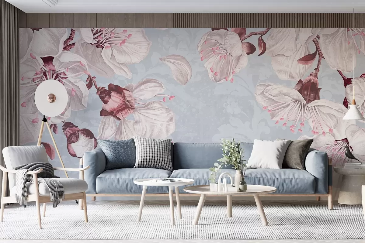 Stenske poslikave Cvetlični tisk z velikimi rožnatimi in belimi češnjevimi cvetovi na svetlo modrem teksturiranem ozadju Št. w08601