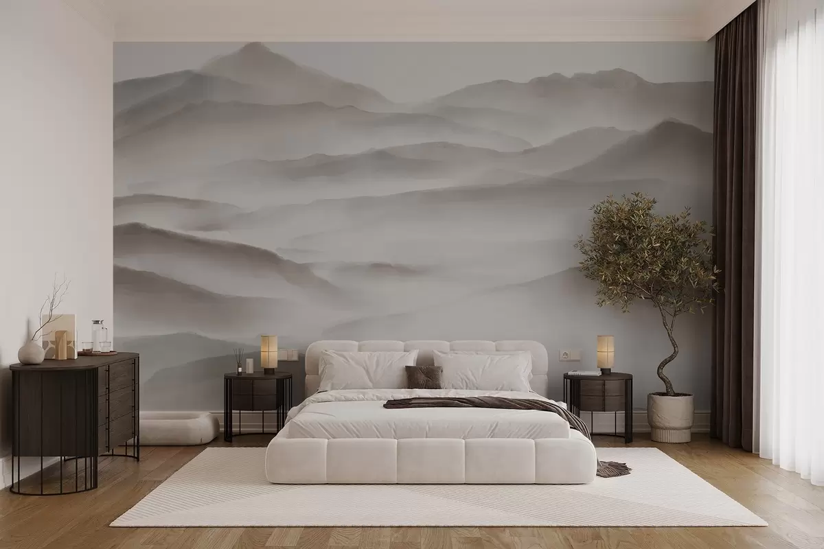 Stenske poslikave Minimalistična gorska pokrajina s hribi in meglo, ki ustvarja miren in atmosferičen odtis Št. w08602