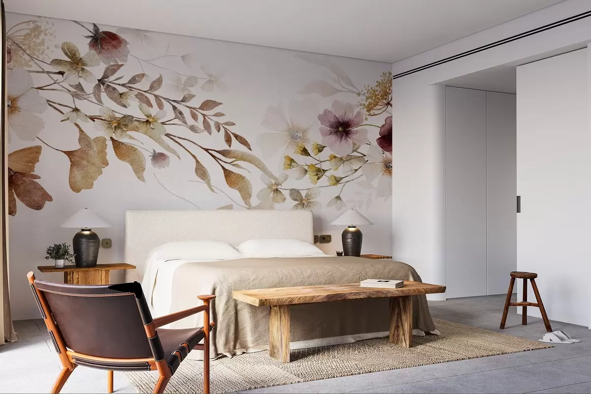 Stenske poslikave Cvetlični aranžma z mehkimi, umirjenimi barvami z bež in belimi cvetovi in listi na svetlem ozadju Št. w08603