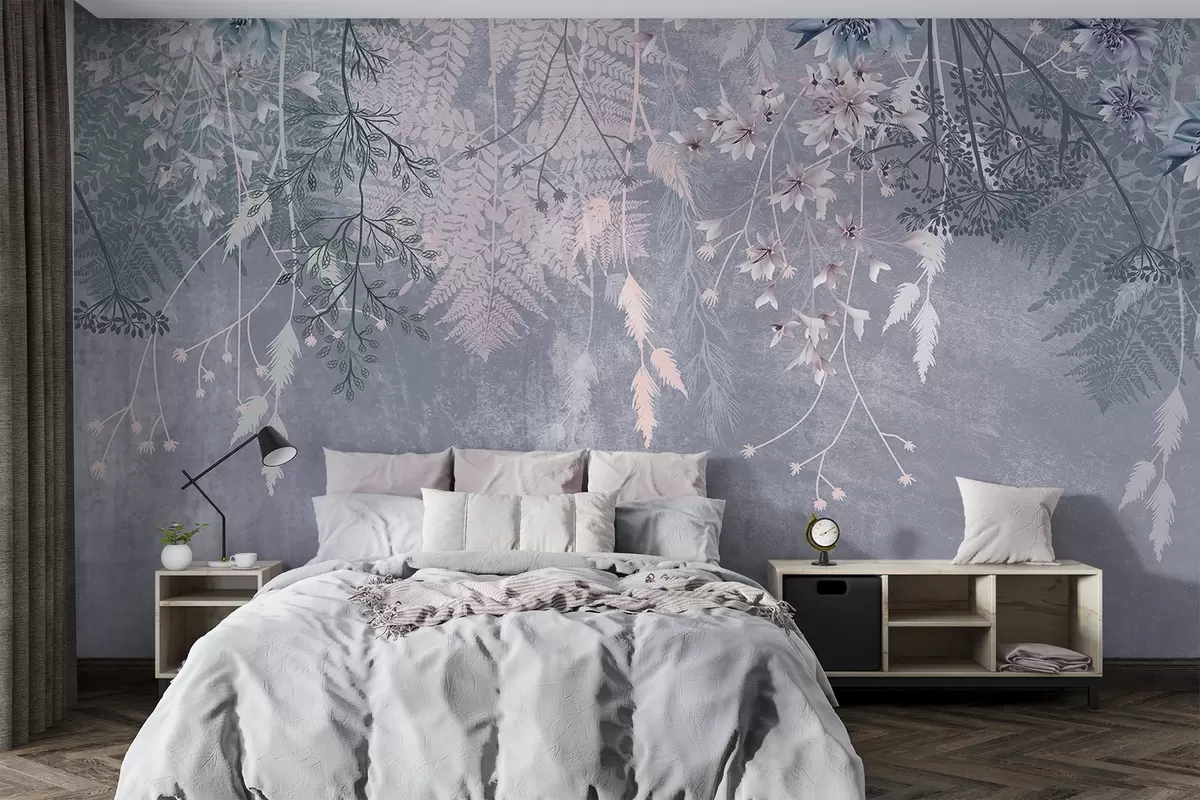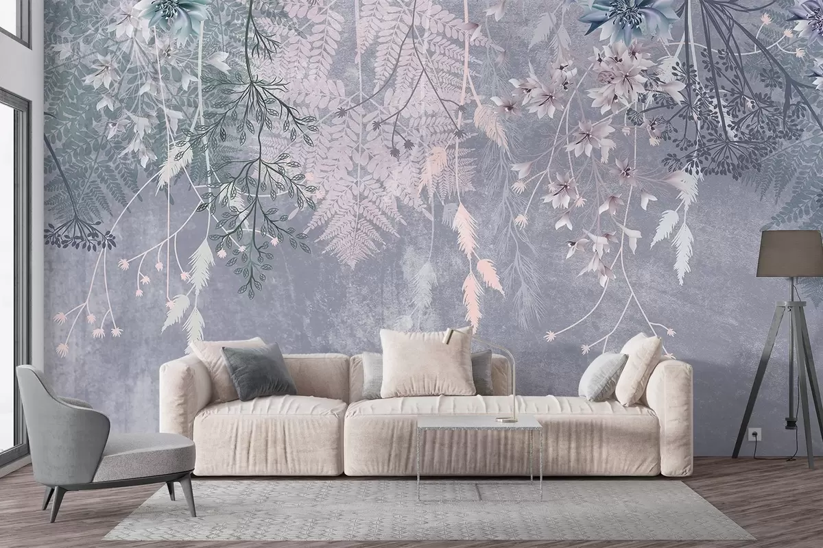 Stenske poslikave Sanjske, občutljive, modrikaste rastline, šopki in cvetovi v modrih pastelnih barvah na meglenem, teksturiranem ozadju Št. w08606