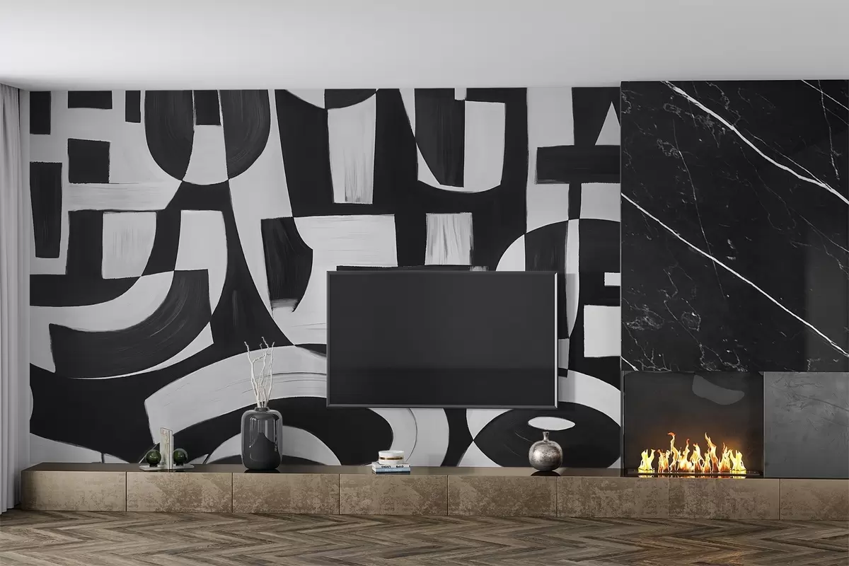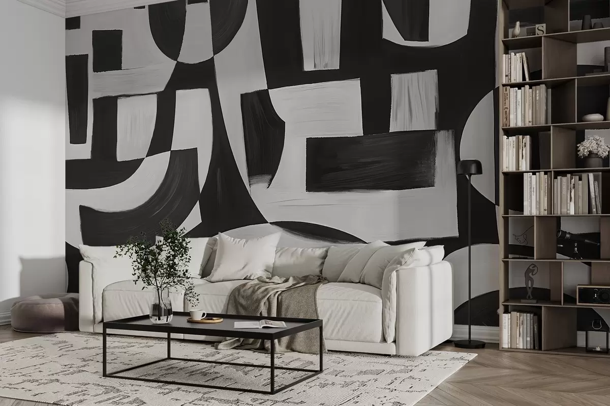 Stenske poslikave Abstraktne črno-bele geometrijske oblike in vzorci, ki ustvarjajo vizualno presenetljivo in dinamično kompozicijo Št. w08608
