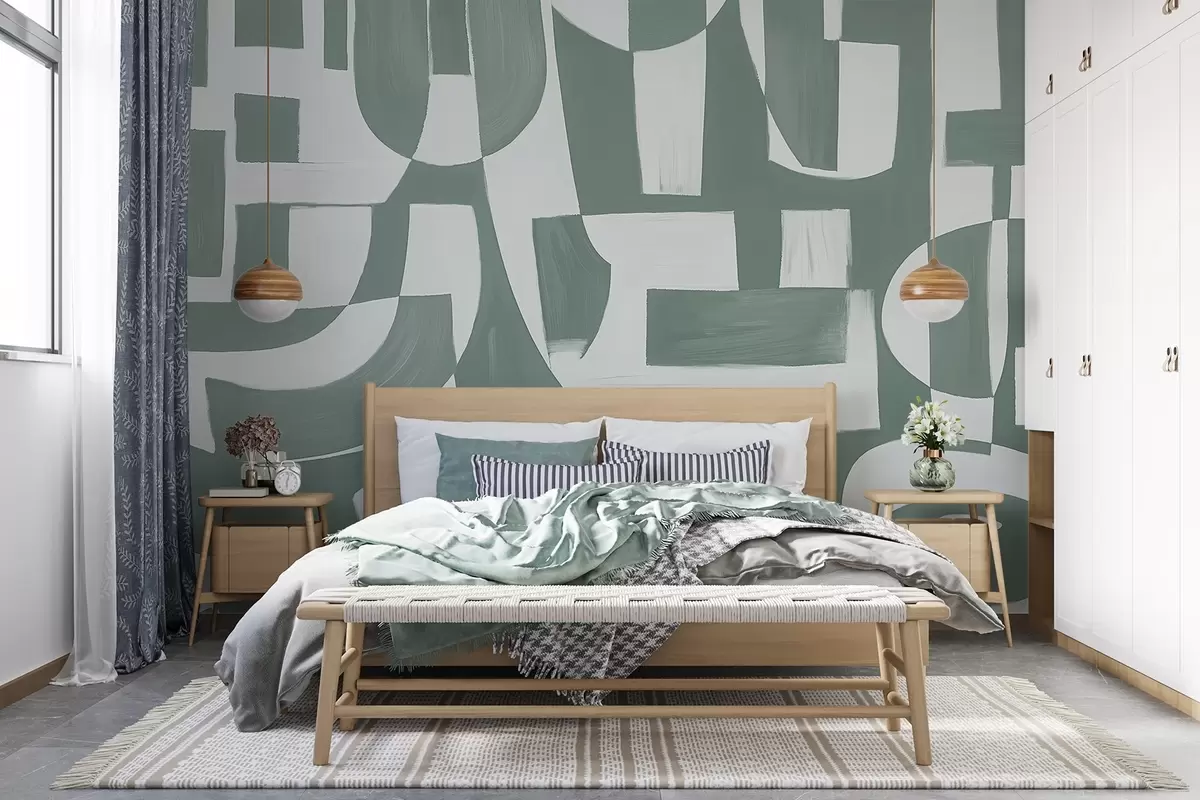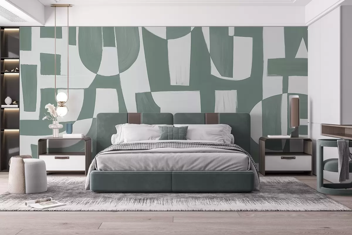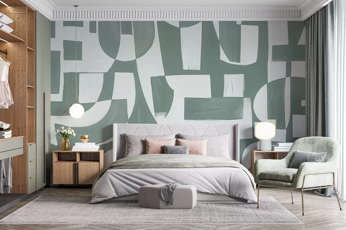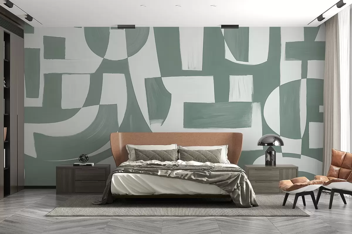 Stenske poslikave Abstraktne zelene in bele geometrijske oblike in vzorci, ki ustvarjajo vizualno presenetljivo in dinamično kompozicijo Št. w08608v1
