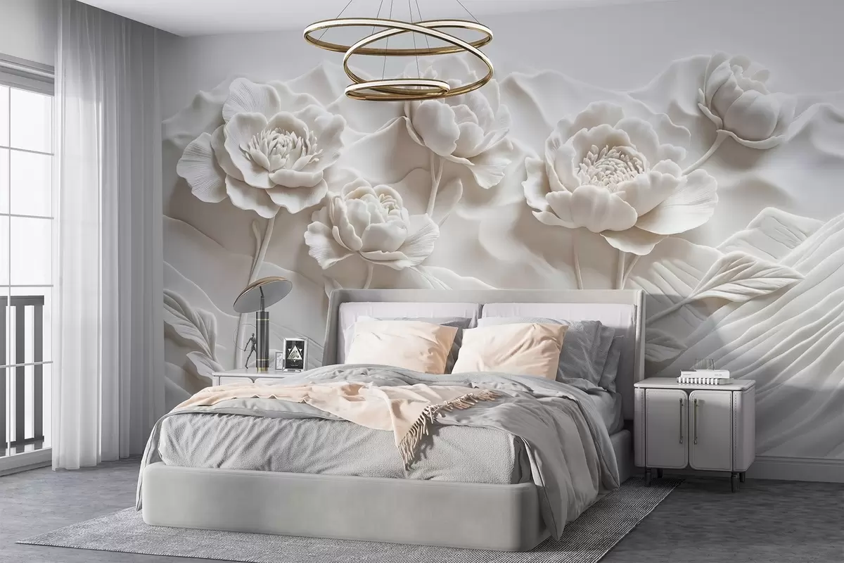 Stenske poslikave Bela cvetlična imitacija reliefne skulpture z velikimi, podrobno izdelanimi cvetovi borovnic na gladkem ozadju Št. w08612
