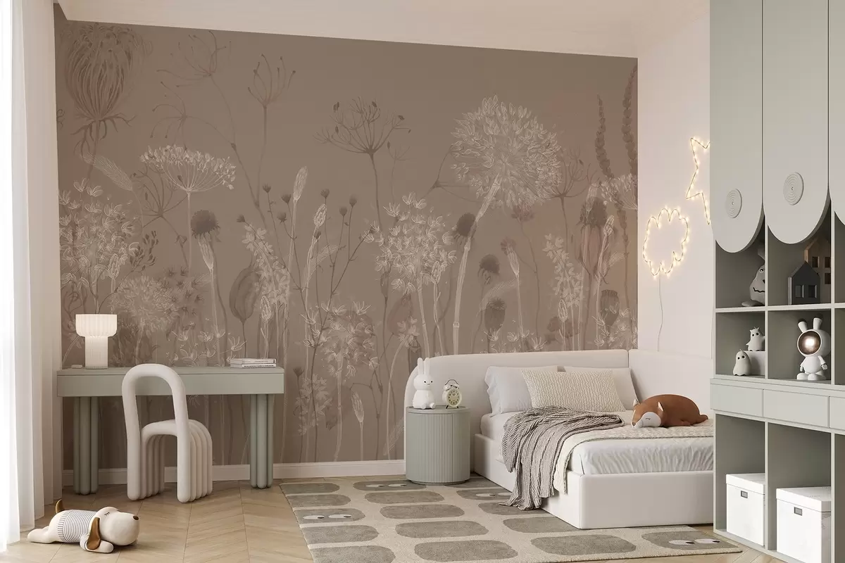 Stenske poslikave Eleganten vzorec z nežnimi regratovci, rastlinami in divjimi cvetlicami v bež-sivih tonih Št. w08637v2