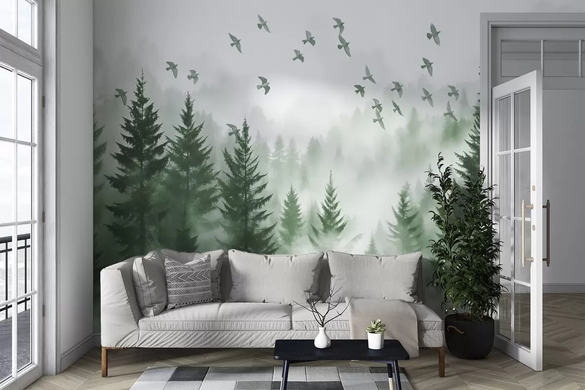 Stenske poslikave Miren meglen gozd z drevesi v zelenih odtenkih, na nebu pa leti jata ptic Št. w08664v1