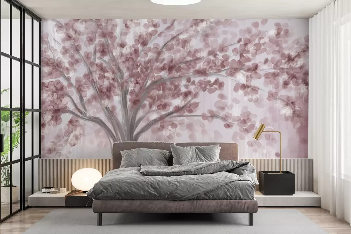 Stenske poslikave Veliko drevo z mehkimi, abstraktnimi listi v roza barvi na svetlem, nevtralnem ozadju, ki poudarja odtenke drevesa Št. w08669v2