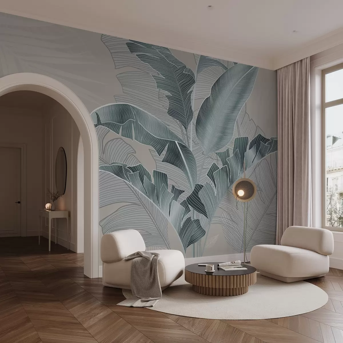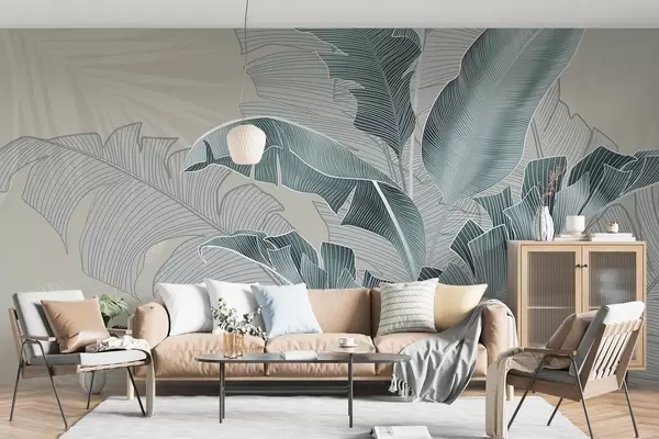 Stenske poslikave Harmonična kompozicija tropskih listov v bež in turkiznih odtenkih s podrobnimi črtami Št. w08698v1