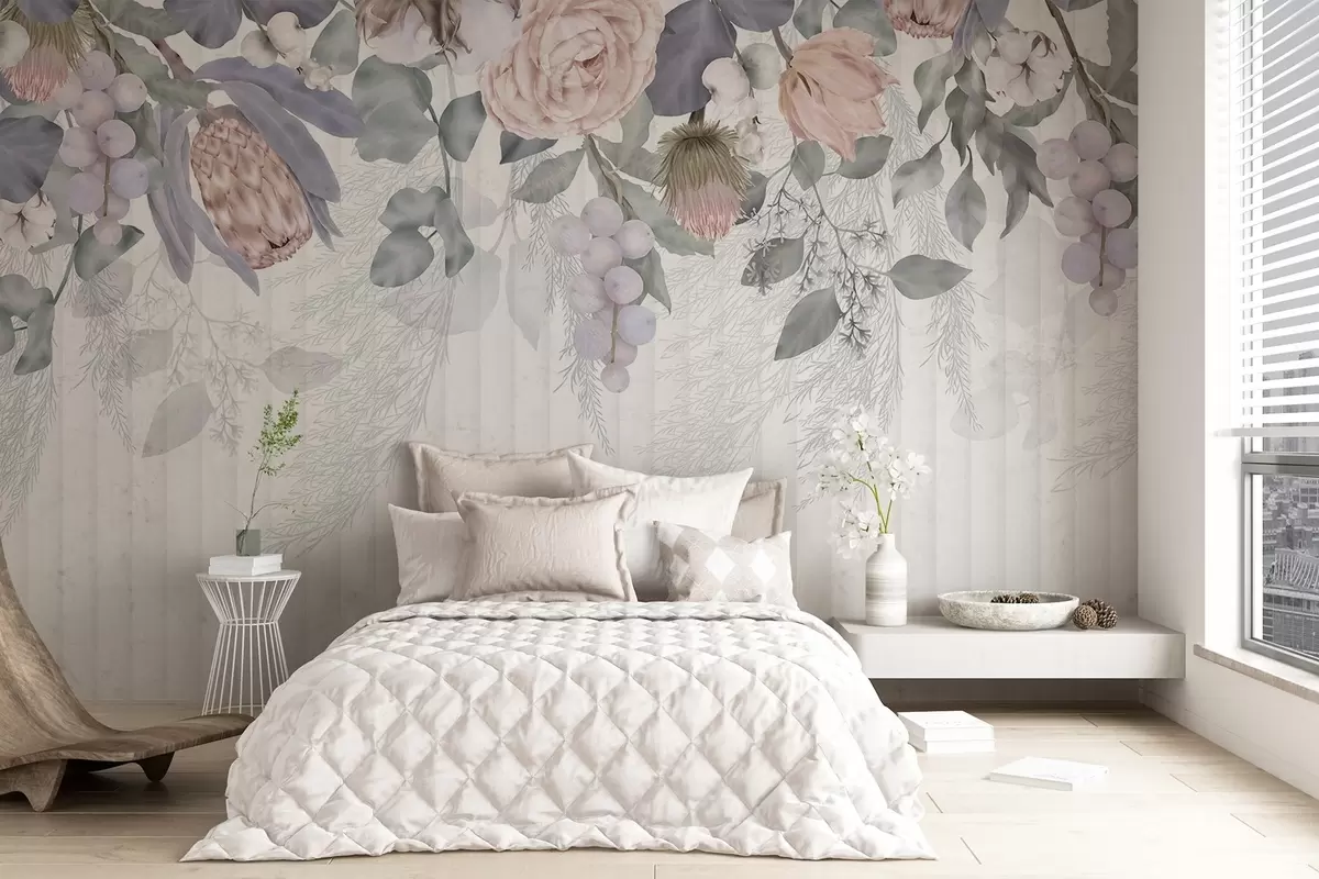 Stenske poslikave Cvetlična pastelno obarvana roza vrtnica, cvetovi proteje, veje evkaliptusa in jagode na teksturiranem ozadju Št. w08700