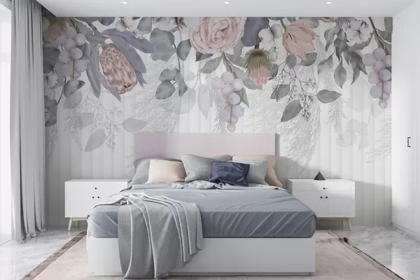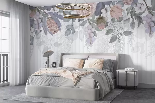 Stenske poslikave Cvetlična pastelno obarvana roza vrtnica, cvetovi proteje, veje evkaliptusa in jagode na teksturiranem ozadju Št. w08700