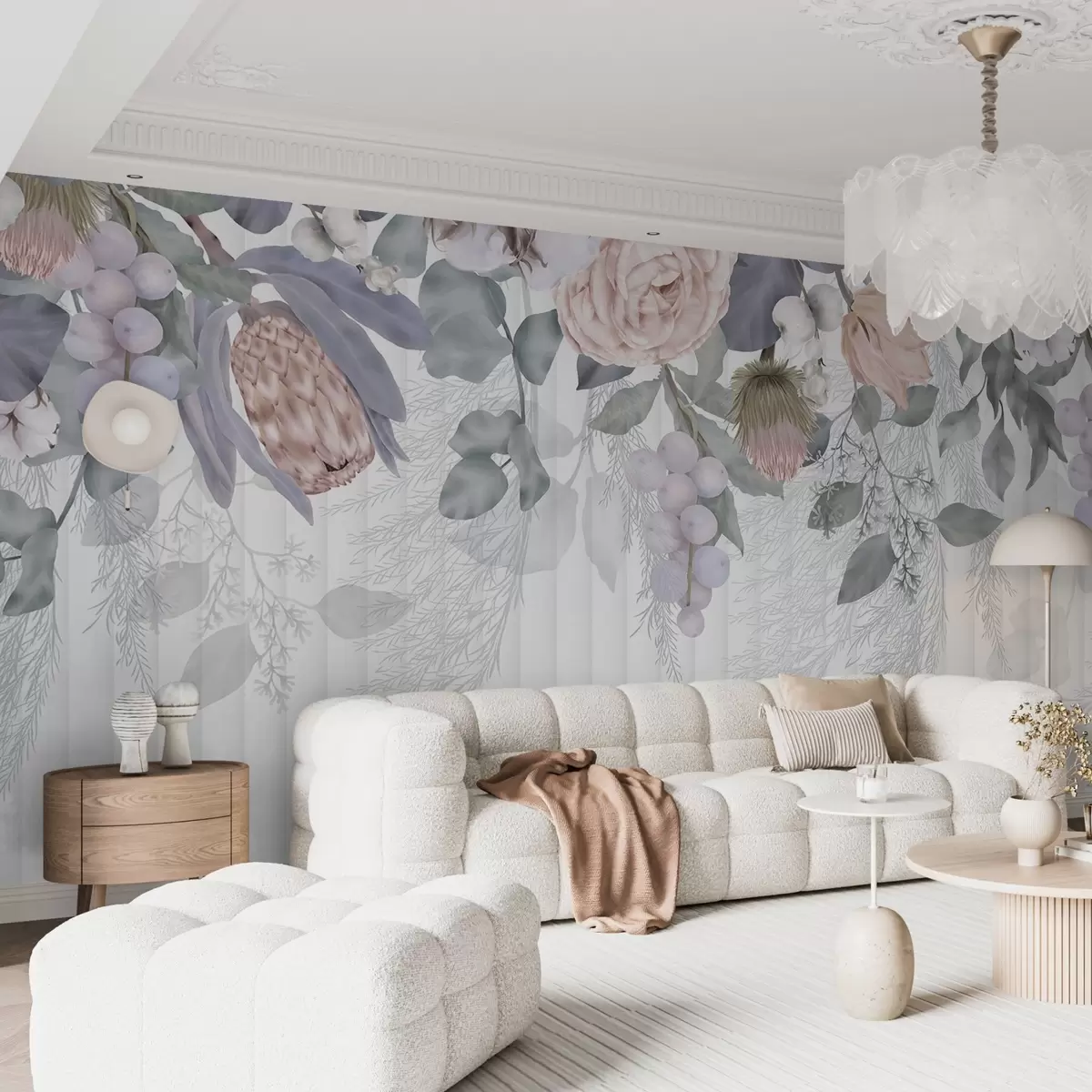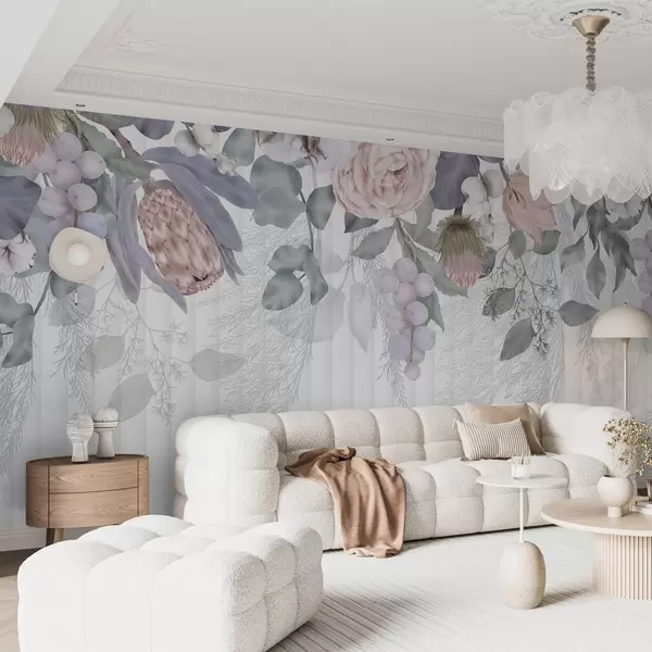 Stenske poslikave Cvetlična pastelno obarvana roza vrtnica, cvetovi proteje, veje evkaliptusa in jagode na teksturiranem ozadju Št. w08700
