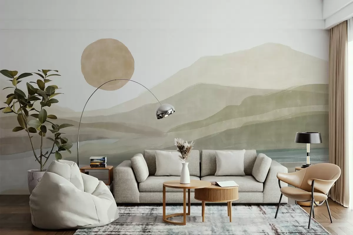 Stenske poslikave Pokrajina s plastovitimi gorami z blagim naklonom, vijugasto reko, oranžnim soncem na nebu Št. w08702