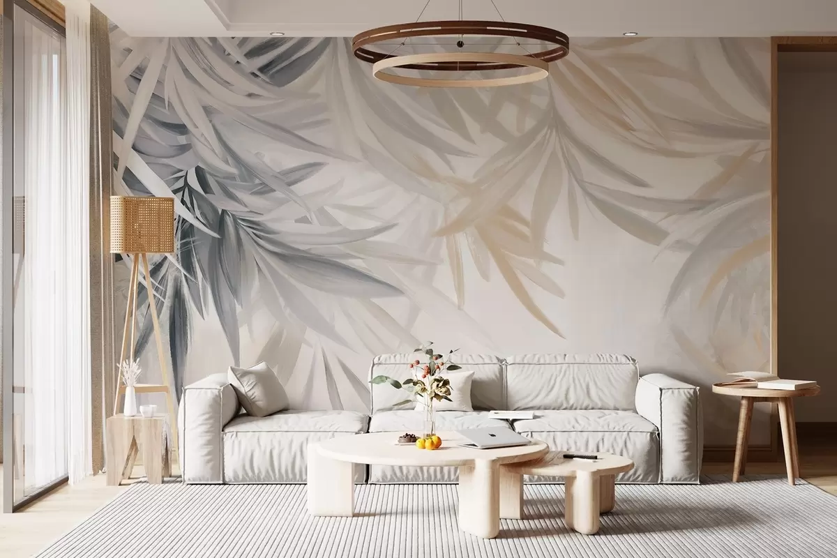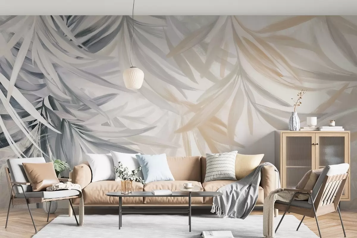 Stenske poslikave Mehki, prelivajoči se svetli tropski listi v odtenkih sive in breskve, ki se prelivajo v svetel, nevtralen tisk Št. w08703