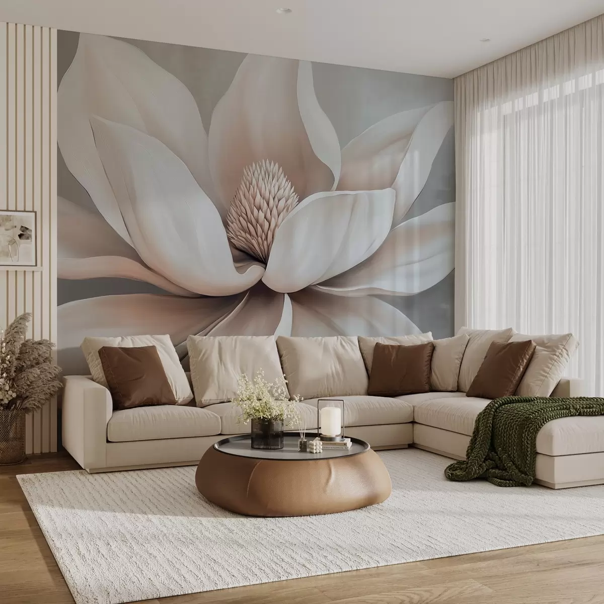 Stenske poslikave Eleganten cvet magnolije z dolgimi, gladkimi cvetnimi listi na mehkem sivem ozadju Št. w08705