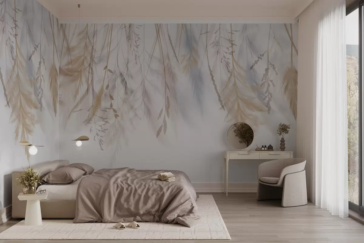 Stenske poslikave Nežne trave, šopki in rastline v pastelnih odtenkih, razporejene v kaskadnem tisku na svetlem ozadju Št. w08737