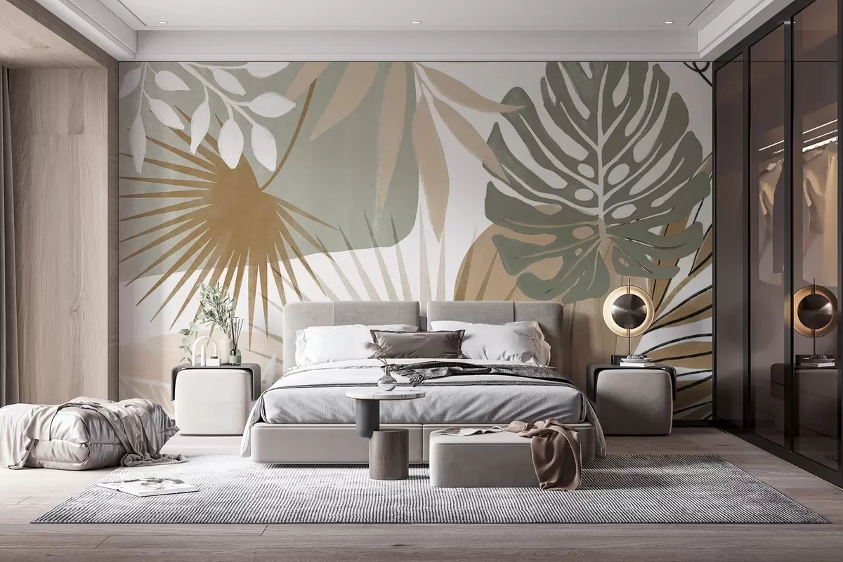 Stenske poslikave Abstraktna oblika z različnimi tropskimi listi v zemeljskih odtenkih zelene, bež in krem barve Št. w08738v1