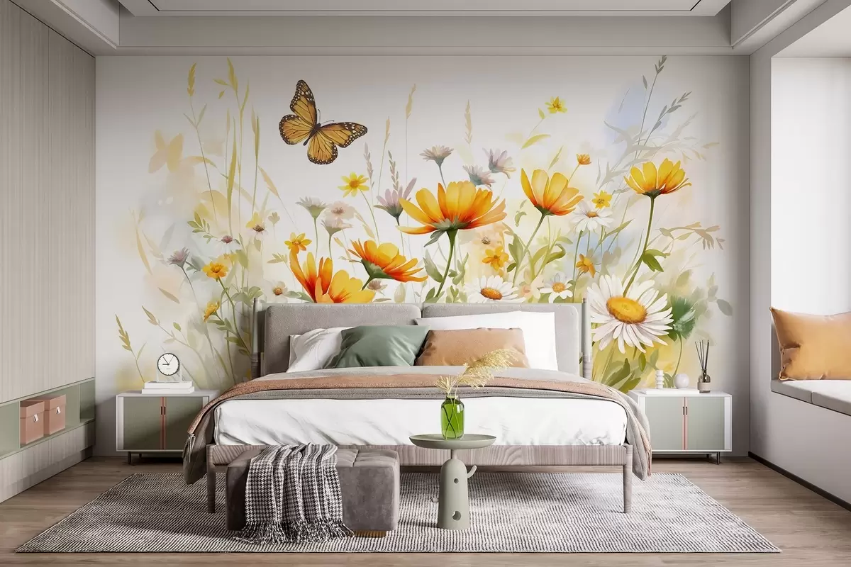 Stenske poslikave Živahno akvarelno polje cvetja z oranžnimi in rumenimi cvetovi z metuljem nad cvetovi Št. w08739