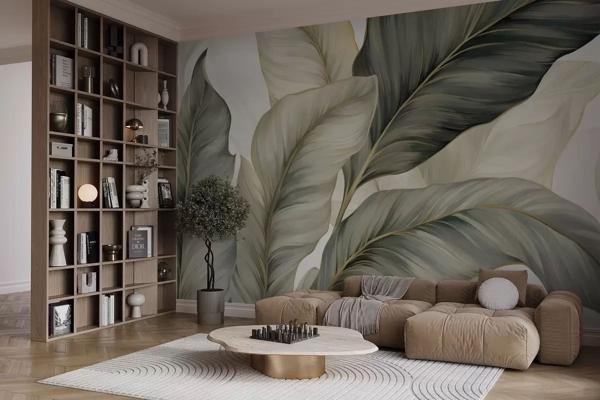 Stenske poslikave Veliki, stilizirani listi s podrobnimi žilami v različnih odtenkih zelene, kremne in bež barve Št. w08785