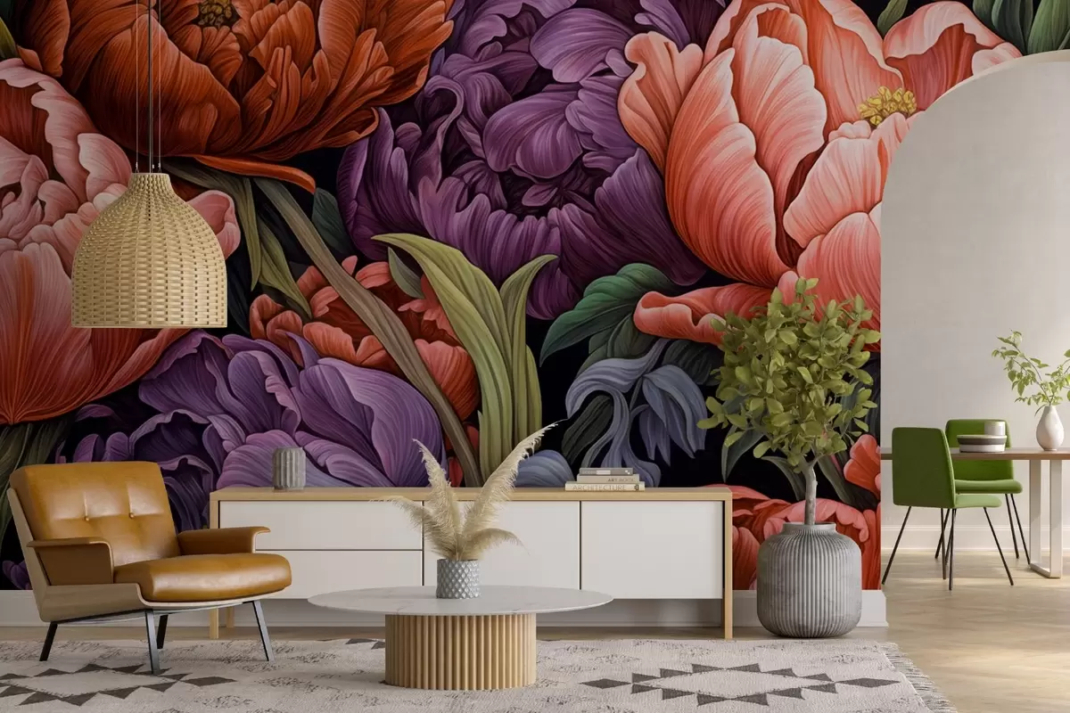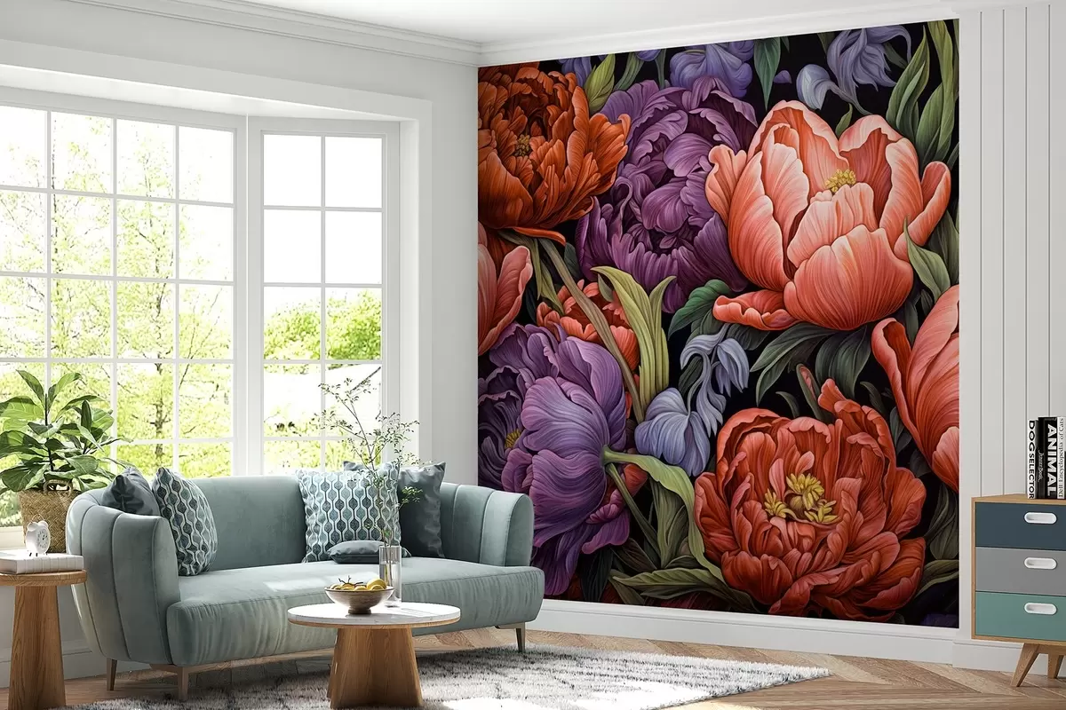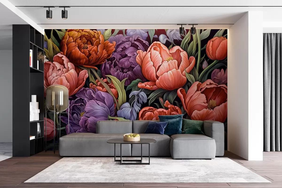 Stenske poslikave Tulipani in pivonke v viktorijanskem slogu, v rdeči in vijolični barvi Št. w08818v1