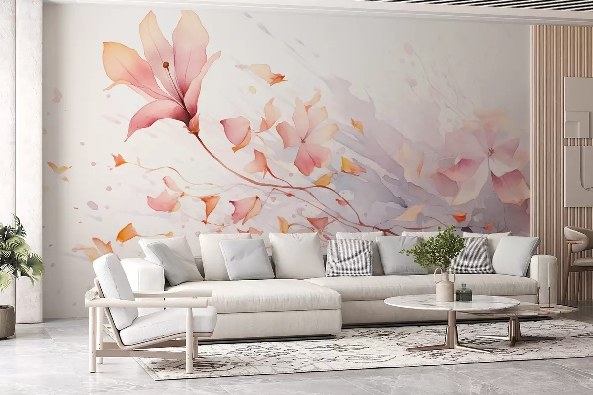 Stenske poslikave Cvet s padajočimi cvetnimi lističi, ki trepetajo v vetru, v akvarelnem slogu Št. w08821
