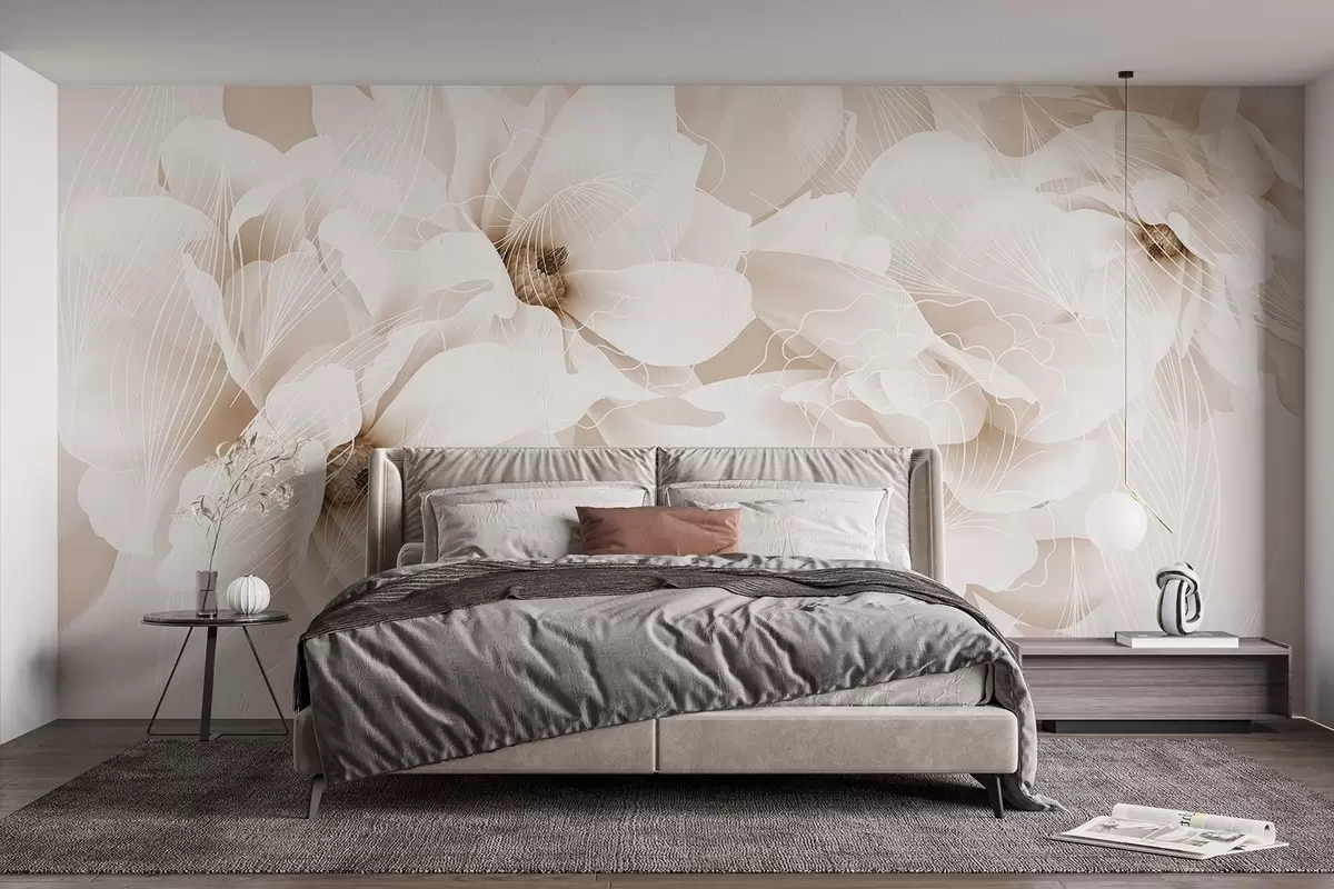 Stenske poslikave Pastelni cvetovi pivonke z belimi in bež nežnimi cvetnimi lističi ter belimi črtami na svetlo bež ozadju Št. w08826v1