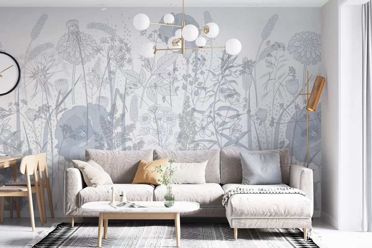 Stenske poslikave Polje visokega cvetja in trave v svetlo modrih pastelnih tonih na belem ozadju Št. w08829