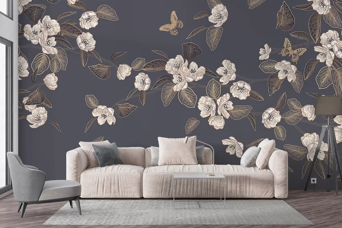Stenske poslikave Veja češnjevega drevesa s cvetovi, listi, metulji na temno sivem ozadju Št. w08830