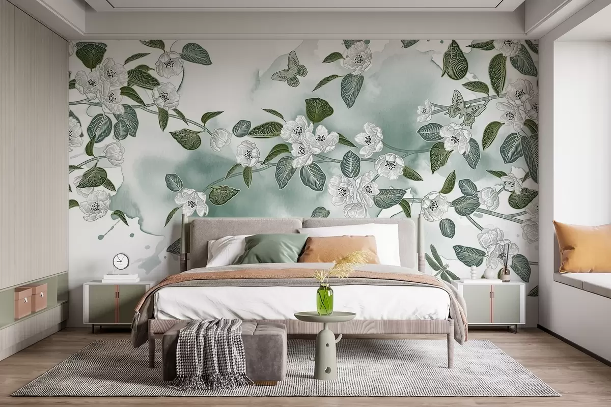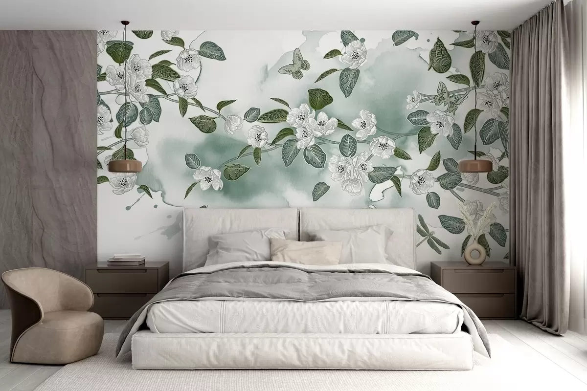 Stenske poslikave Veja češnjevega drevesa s cvetjem, listi, metulji na svetlo zelenem akvarelnem teksturiranem ozadju Št. w08831