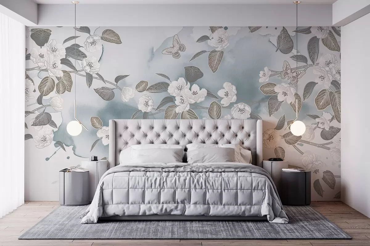 Stenske poslikave Veja češnjevega drevesa s cvetjem, listi, metulji na svetlo modrem akvarelnem teksturiranem ozadju Št. w08831v1