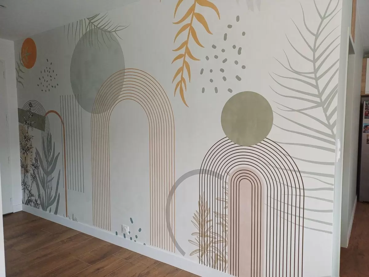 Stenske poslikave Abstraktni tisk z geometrijskimi oblikami, loki in tropskimi listi na belem ozadju Št. w08835
