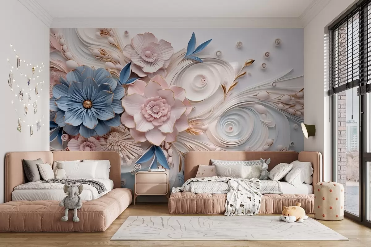 Stenske poslikave Nežna cvetlična kompozicija v rožnatih in modrih tonih z mehkim reliefnim ozadjem Št. w08847