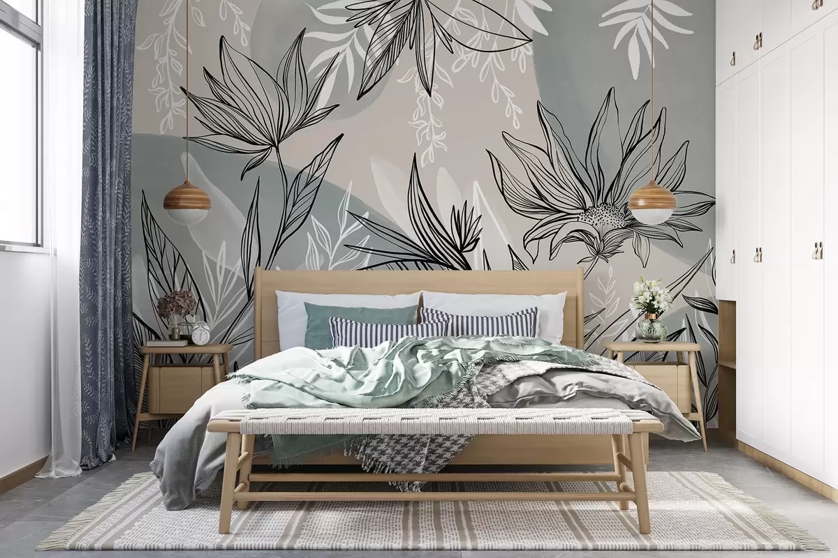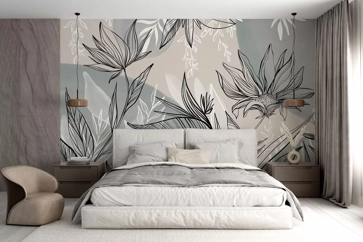 Stenske poslikave Cvetlične črte z velikimi listi in cvetovi na ozadju bež in modrih akvarelnih odtenkov Št. w08865