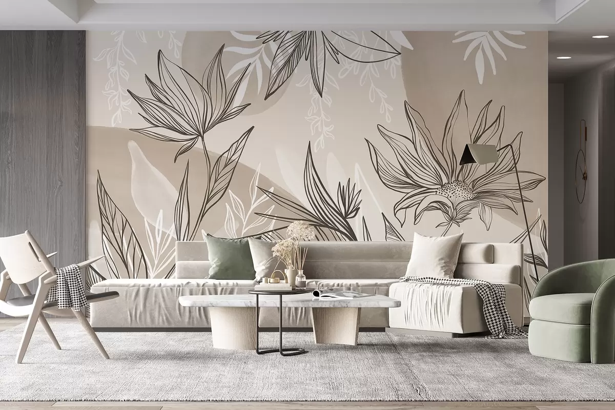 Stenske poslikave Cvetlične črte z velikimi listi in cvetovi na ozadju bež akvarelnih odtenkov Št. w08865v1
