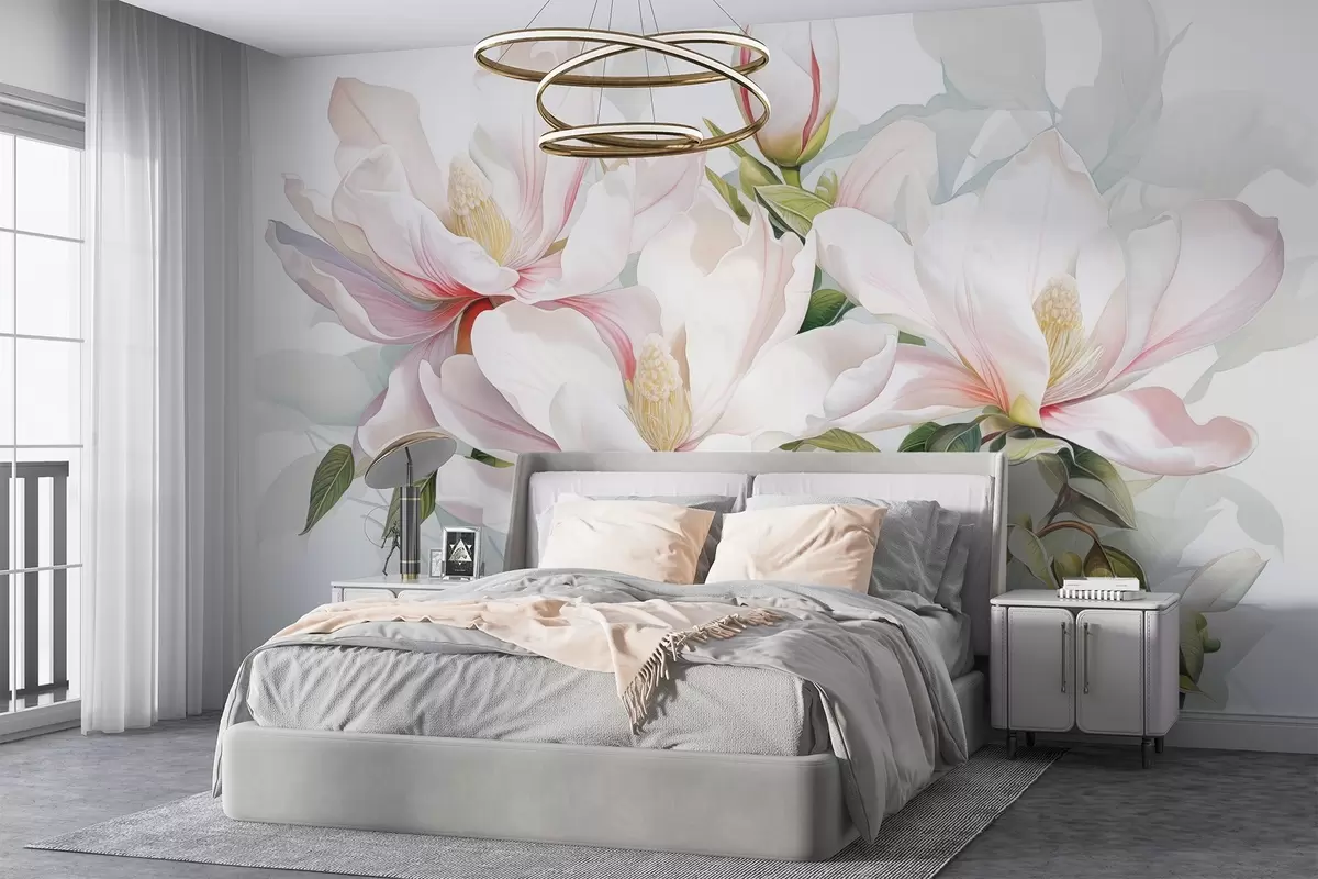 Stenske poslikave Cvetovi magnolije z belimi in rožnatimi cvetnimi listi, listi in rjavimi vejami, mehki in občutljivi akvarelni slog Št. w08885