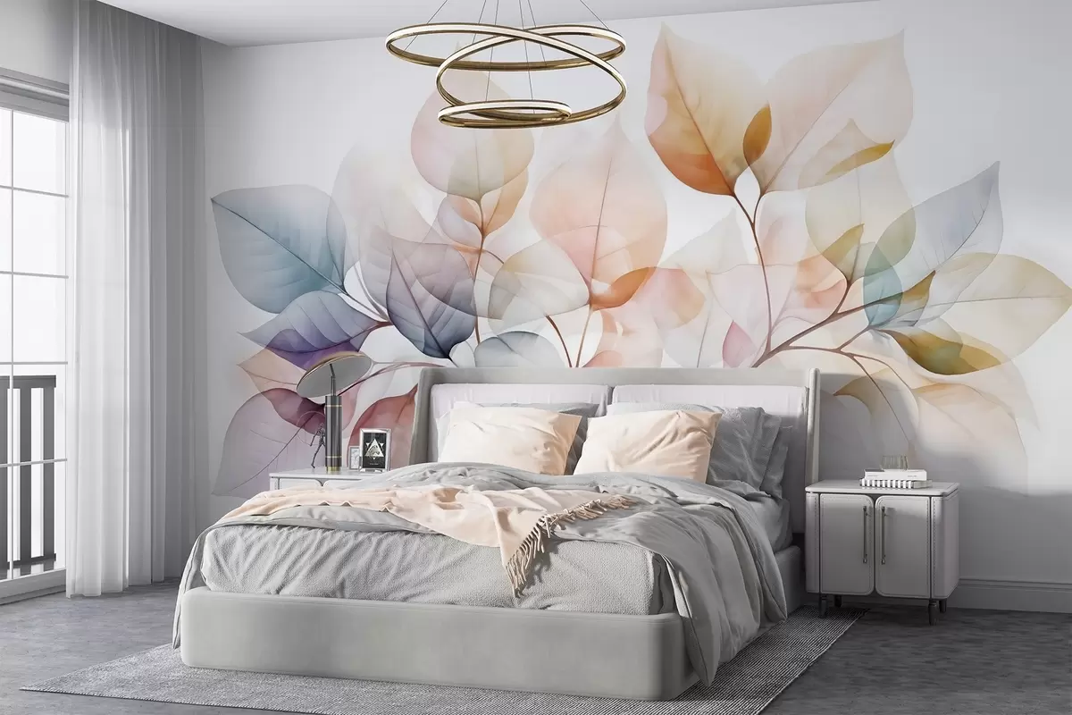 Stenske poslikave Akvarelna slika prosojnih listov v pastelnih barvah z odtenki rožnate, bele, vijolične in modre Št. w08910
