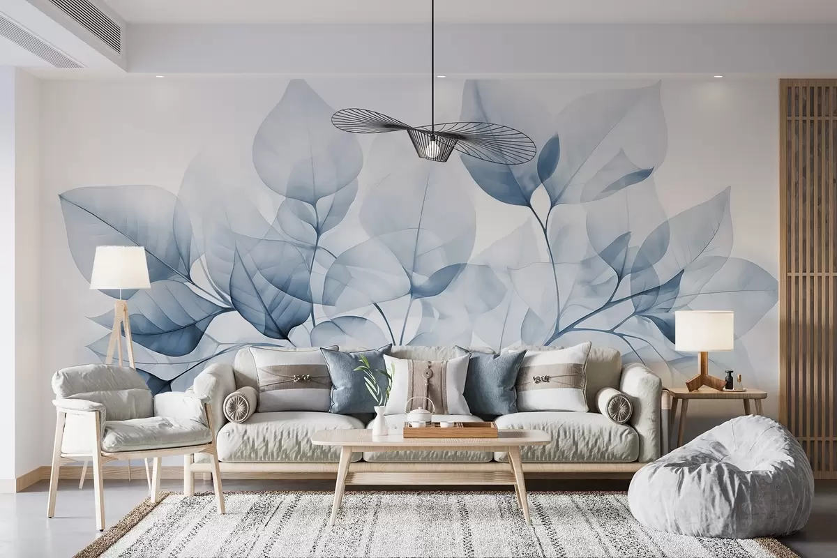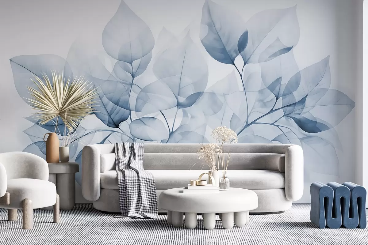 Stenske poslikave Akvarelna slika prosojnih listov v pastelnih barvah z odtenki bele in modre Št. w08910v1