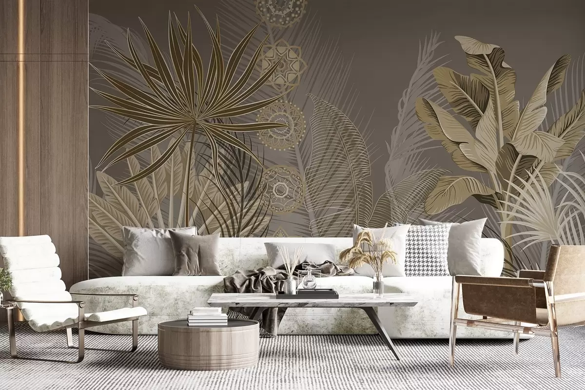 Stenske poslikave Tropski listi v bež in rjavih tonih, palmovi listi, listi banan in okraski mandale, temno ozadje Št. w08913v1