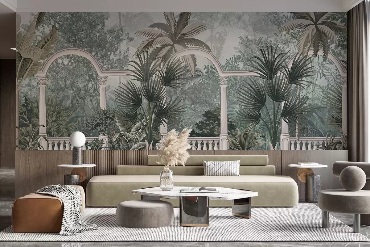 Stenske poslikave Vrt s tropsko teksturo, palmami in bujno vegetacijo, balustrada z loki, umirjene barve, vintage slog Št. w08916