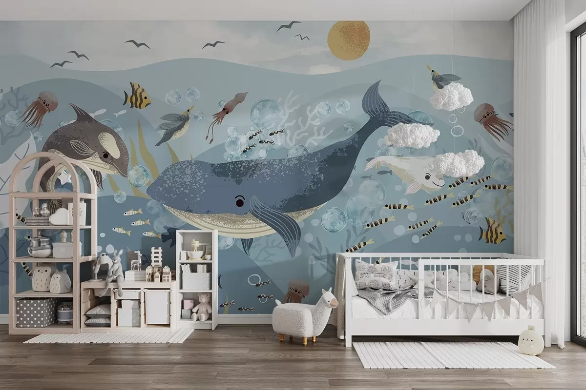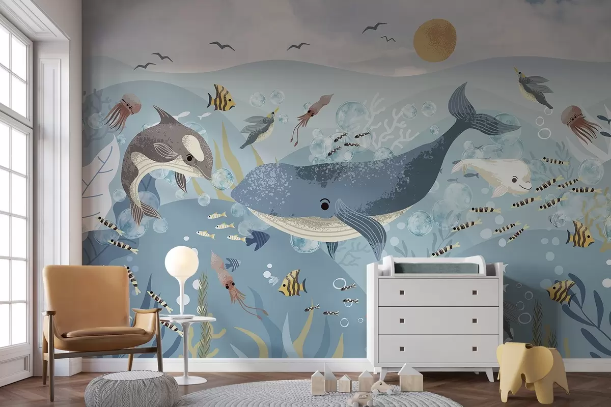 Stenske poslikave Otroška ilustracija srčkan tisk z modrim kitom, obkroženim z ribami, lignji, meduzami v modrem oceanu z mehurčki Št. w08921