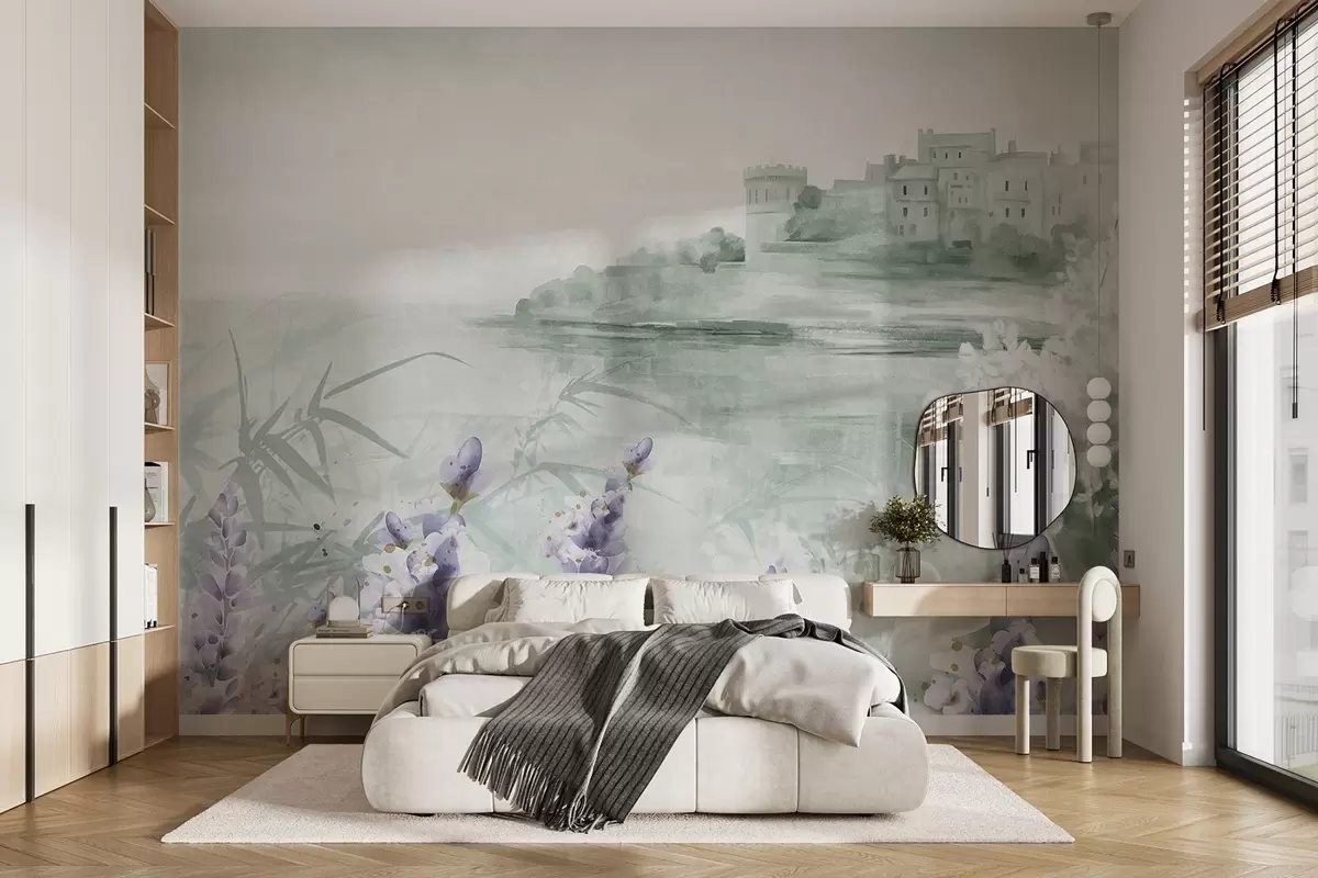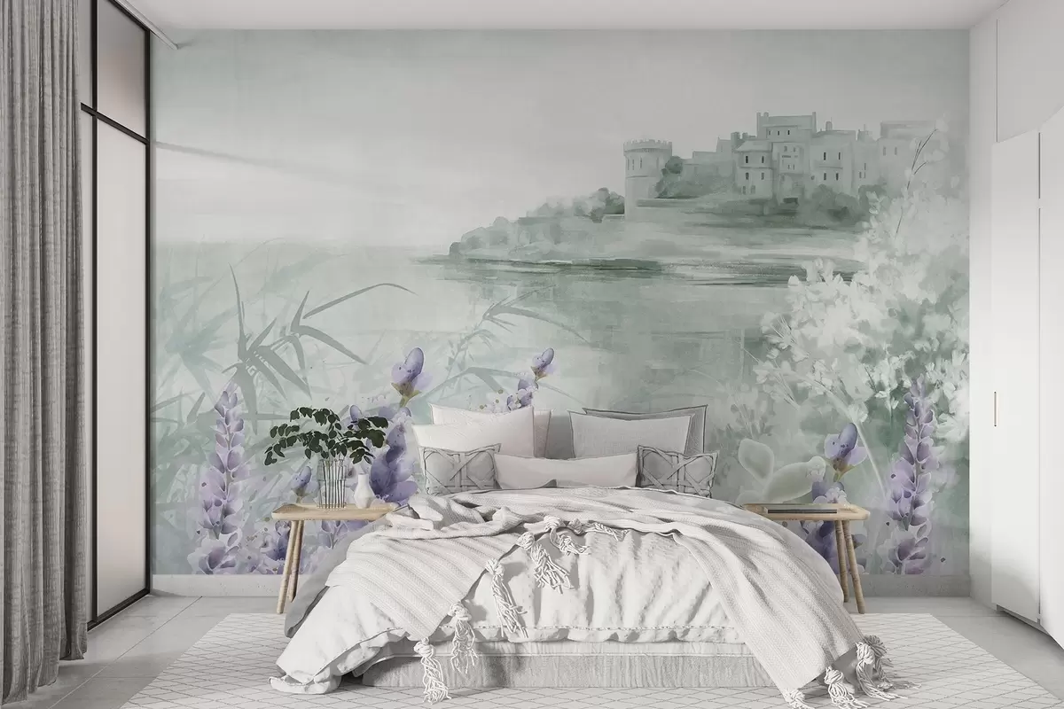 Stenske poslikave Teksturirana vintage pokrajina z gradom na pečini s pogledom na morje, s cvetovi sivke v umirjenih barvah Št. w08975