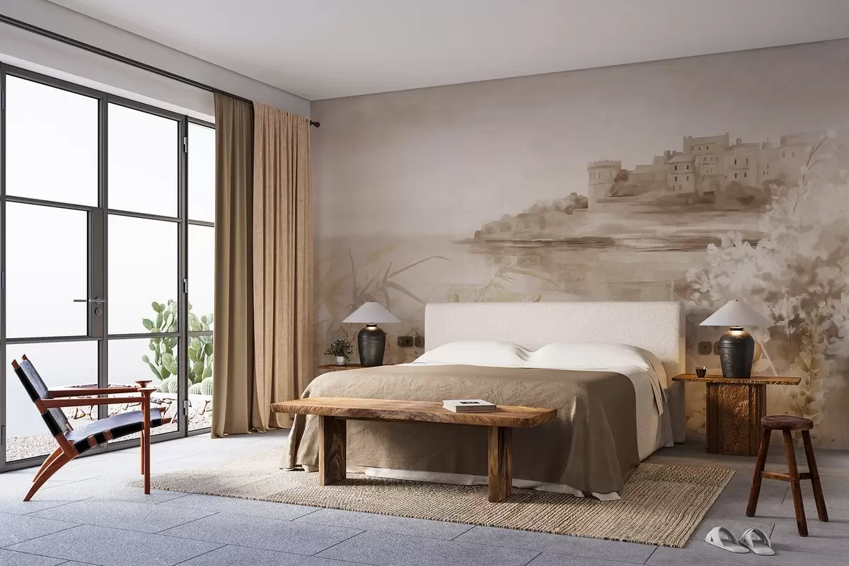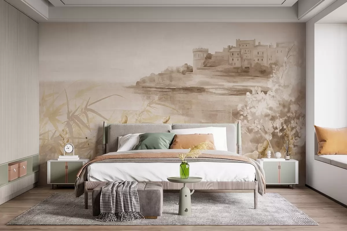 Stenske poslikave Teksturirana vintage pokrajina z gradom na pečini s pogledom na morje, s cvetovi sivke v umirjenih barvah Št. w08975v1